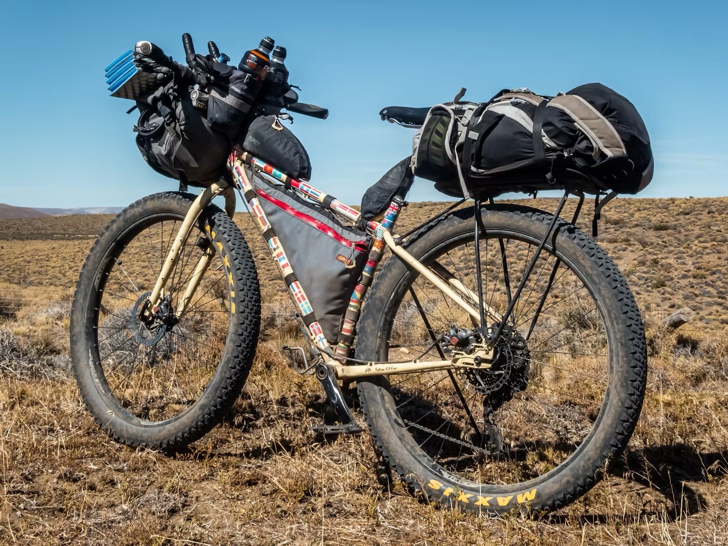 I am, unashamedly, a huge gear nerd. I’m also a bit of a perfectionist, and having been cycling around the world for more than three years now I’ve had ample time in the saddle, literally thousands of hours, to puzzle over optimising my bike and gear setup. I’ve changed things up several times over the years, inching closer to what I consider ‘the perfect setup’. Now, finally, I think I’ve got as close as I can to that perfection. There are one or two minor things I might tweak, but after three years of trial and error, the core of my system is now exactly where I want it. As far as I’m concerned I now have the ultimate all-round, round-the-world, hardcore expedition ready rig. This setup is fairly lightweight (base weight of bike + gear is around 28kg) but has a capacity of over 70 litres and allows me to easily carry food for more than two weeks while simultaneously carrying 13 litres of water. Versatility is huge and I can easily expand on my capacity if needed; if I had to I could stretch this to carry a month’s food without too much difficulty. Convenience is also fantastic and this setup is a pleasure to use.